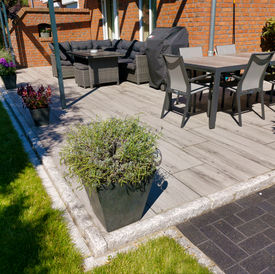Außen- und Nebenterrasse mit Gehweg und Rollrasen.